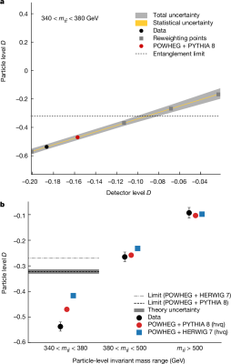 Les valeurs indiquées prennent en compte les processus de radiations et d’hadronisation qui surviennent avant que les particules stables puissent être mesurées par ATLAS. Ceci explique que les limites d’intrications (en gris) ne sont pas exactement à -1/3 et pourquoi elles dépendent du modèle utilisé pour décrire ces phénomènes de radiations et d’hadronisation. Les données en noir montrent clairement que le système top-antitop est intriqué à basse masse invariante.